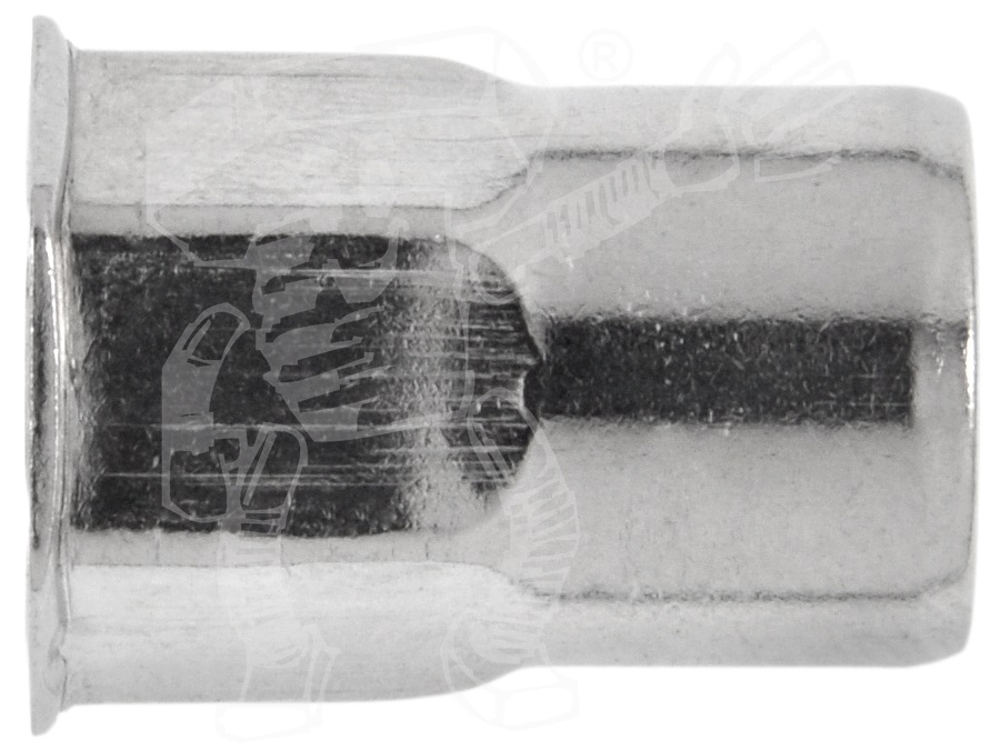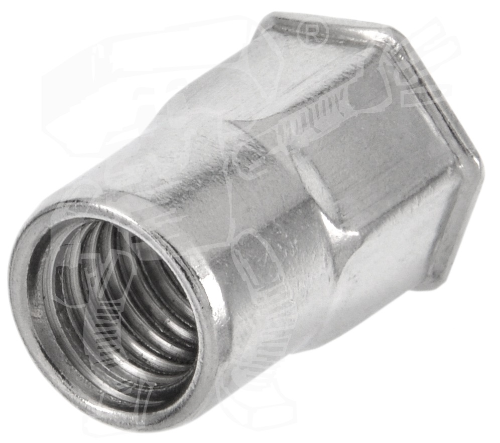 € Offene Blindnietmuttern mit Senkkopf und Außensechskant bringen an einem Blech ein metrisches Gewinde an. Sie sind Hülsen, die einerseits ein Innengewinde und andererseits einen Kragen haben. Diese Blindnietmuttern haben einen oben einen Senkkopf, der plan mit dem Untergrund abschließt, und einen Außensechskantschaft unten.