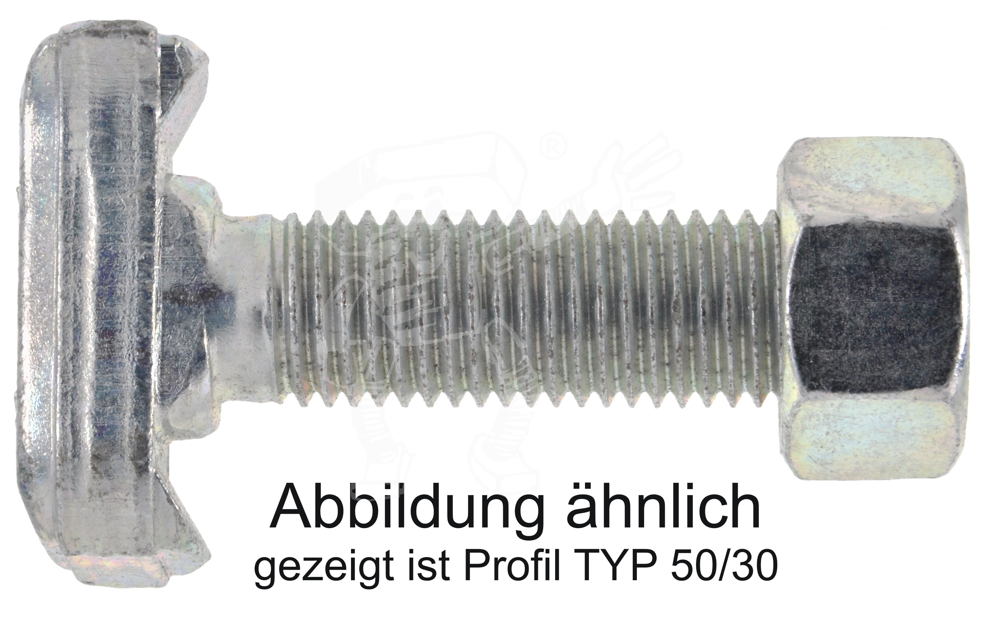 Hammerkopf-Halfen-Schrauben, TYP 28/15, mit Sechskantmutter, für Profile 28/15 - 28/12 - 28/28 - 26/26 sind Sonderschraube mit metrischem Regelgewinde (M), die einen speziellen als Haken ausgeformten Kopf haben. Halfen® ist dabei ein Markenname des bekanntesten Herstellers. Der Hakenkopf wird in eine passende Profil-Schiene eingeführt und gleitet in diesem Profil. Halfenschrauben oder Hammerkopfschrauben werden besonders im Stahl- und Anlagen-, Maschinen- und Fahrzeugbau verwendet. Sie sind kompatibel mit Halfenschrauben und werden von uns in den Werkstoffen Stahl blank und Stahl galvanisch verzinkt angeboten. Damit werden Stahlhallen, Balkone, Maschinen oder Anlagen verschraubt. Diese Schrauben werden mit passender Sechskantmutter (nicht Gleitmutter!) geliefert.