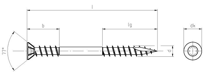 Technische Maße für Terrassenschrauben, Senkkopf, Unterkopfgewinde, Innensechsrund (TX)