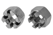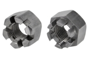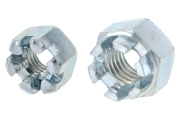 Kronenmuttern sind Sechskantmuttern, deren Mutternkopf mehrfach geschlitzt wurde, sodass die typischen Zacken einer Krone entstehen. Daher auch der Name Kronenmutter. Sie erhalten bei uns Kronenmuttern sowohl in der normalen Höhe als auch besonders hoch.  Die Kronenmutter gehört zu den Schrauben-Sicherungselementen. Mithilfe eines Splints oder Draht wird der Bolzen durch die Kronenmutter formschlüssig gegen Drehen mit dem Schraubenschaft verbunden. mehr ...
