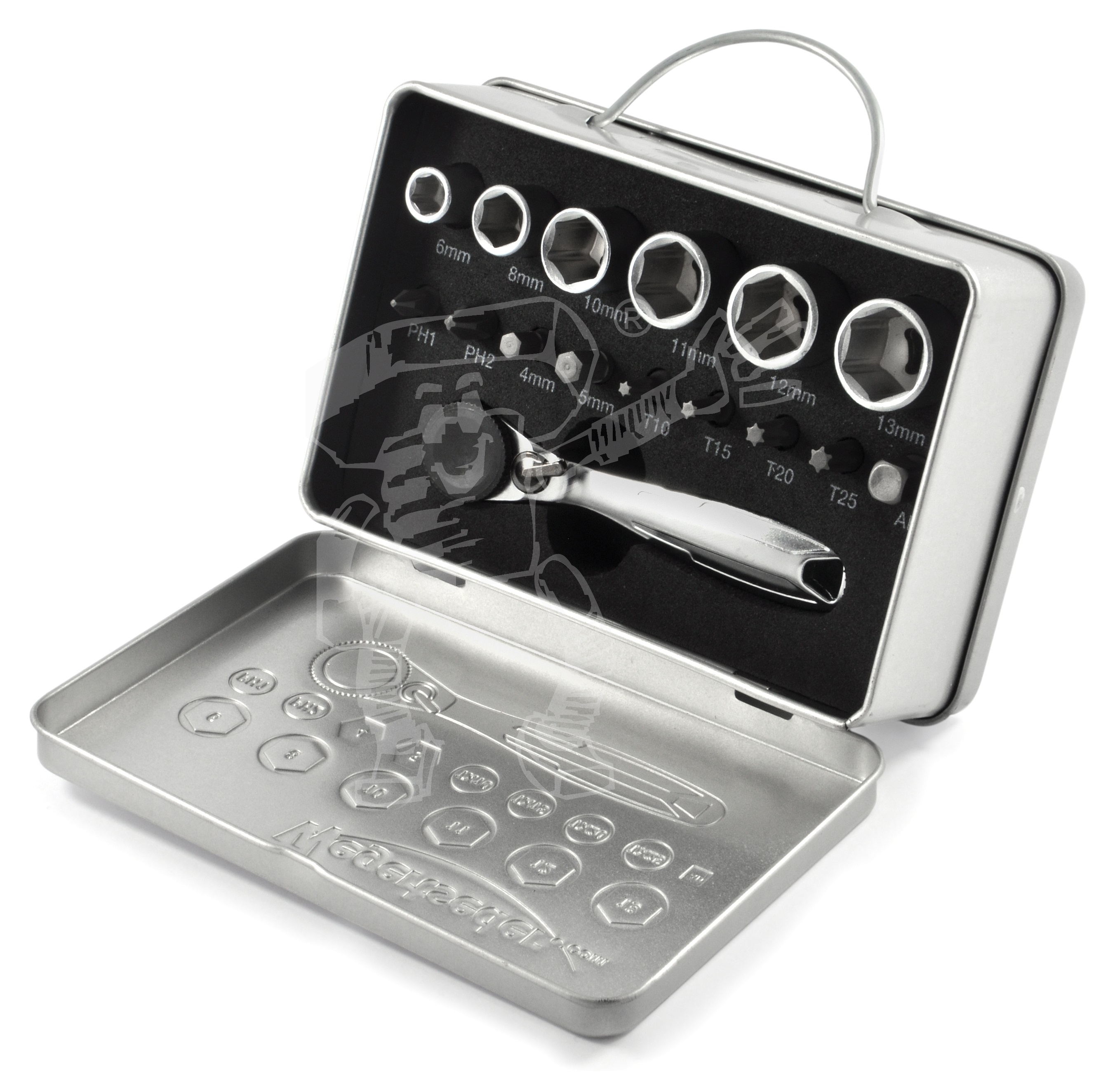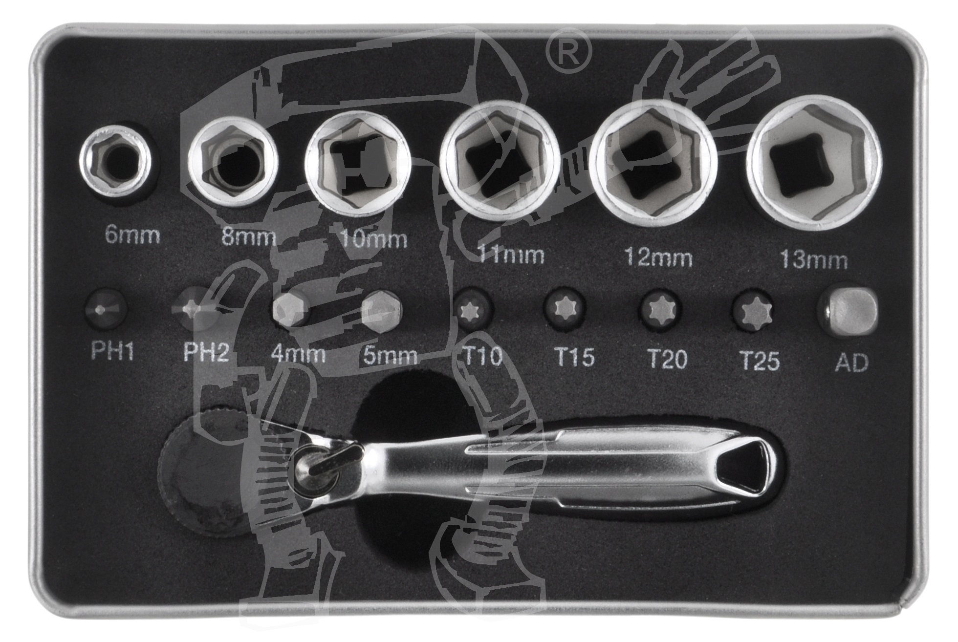 16-teiliges Knarrenset mit 8 Schrauberbits, 6 Stecknüssen und 1 1/4“-Adapter in Profi Qualität
