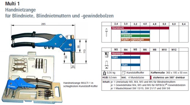 Nietwerkzeuge dienen zur Verarbeitung von Blindnieten und oder Blindnietmuttern. Manche Werkzeuge können beide Produkte verarbeiten, andere wieder nur eines. Die Nietwerkzeuge sind meist aus Werkzeugstahl gefertigt und werden in einem Plastikkoffer geliefert.