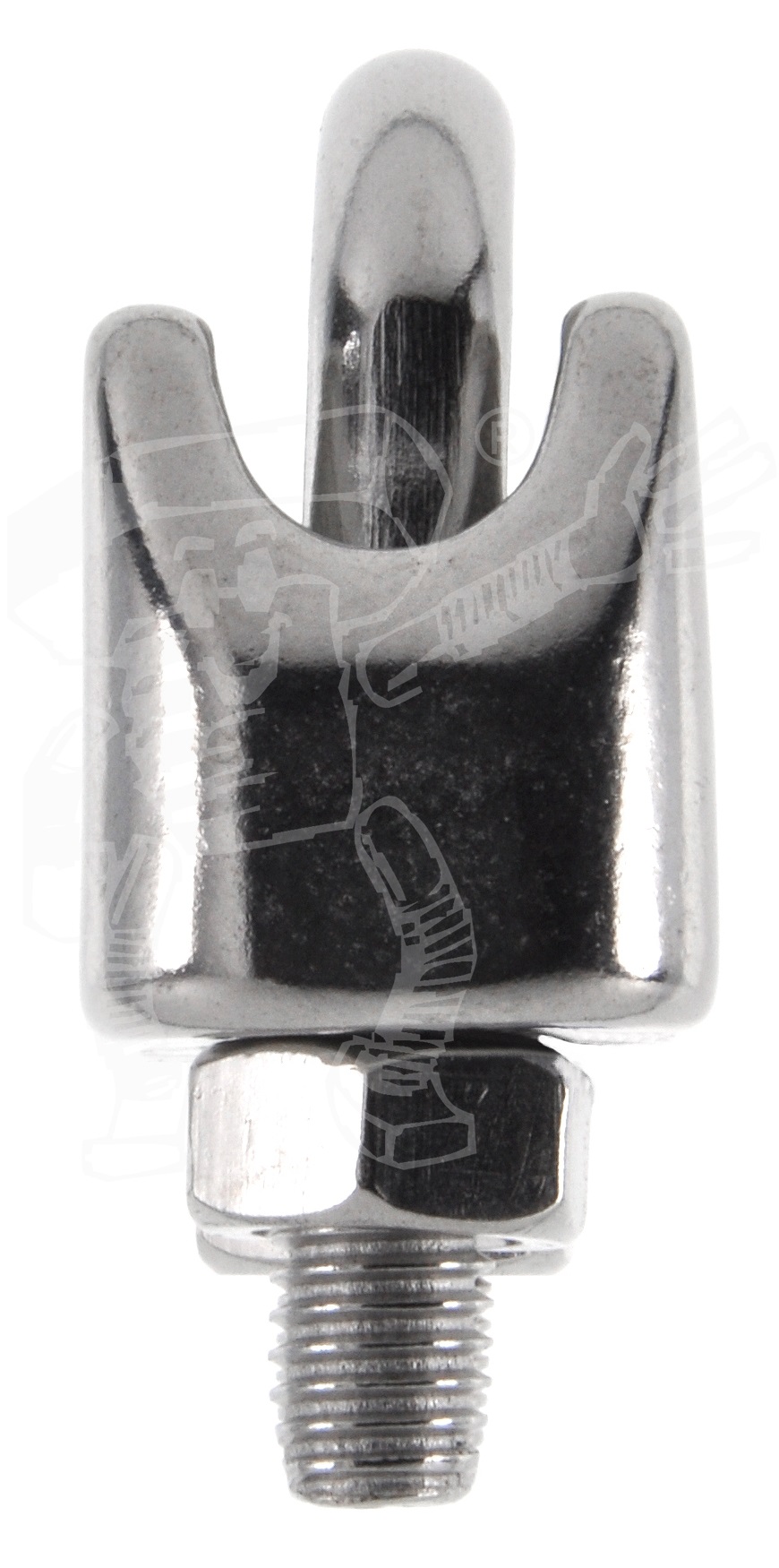 € Drahtseilklemmen ähnlich DIN 741 sind gebogene Metallbügel, welche in einem Gegenstück fixiert sind. An beiden Enden hat die Drahtseilklemme ein metrisches Außengewinde. Zieht man eine Mutter an diesem Gewinde fest, schließt sich die Fläche zwischen Metallbügel und Gehäuse und das eingefädelte Seil wird fixiert.